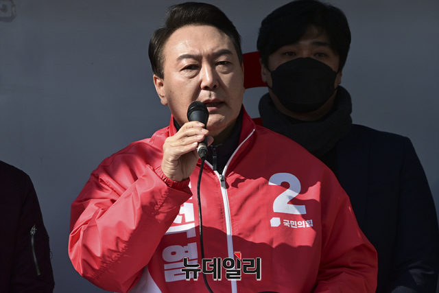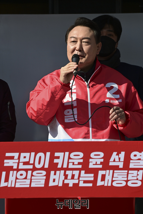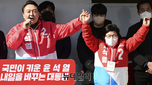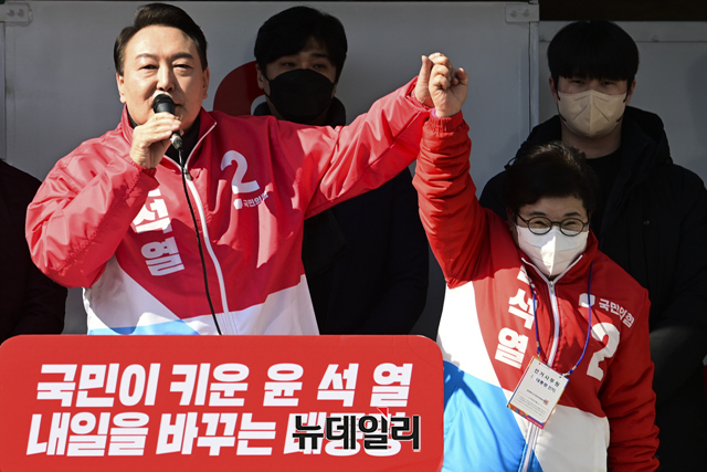윤석열 국민의힘 대선후보와 임이자 직능총괄본부장이 18일 오전 경북 상주시 풍물시장에서 열린 대한민국 농업의 수도 상주의 힘! 내일을 바꾸는 대통령! 유세 현장에서 지지를 호소 하고 있다. (경북 상주=강민석 기자)
