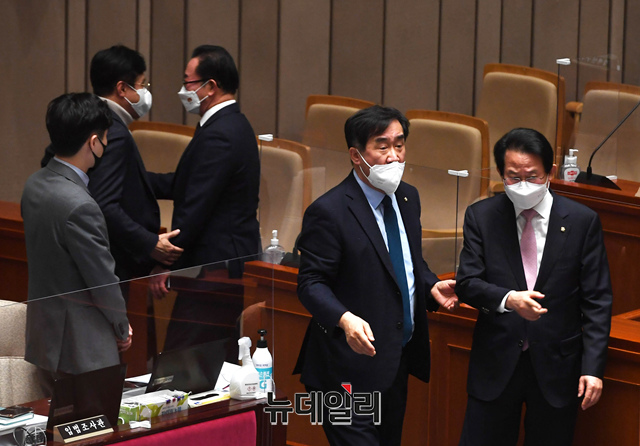 맹성규 더불어민주당 예결위 간사가 18일 오후 국회에서 열린 예산결산특별위원회 전체회의가 정회되자 이종배 예결위원장에게 항의하고 있다. (사진=공동취재단)