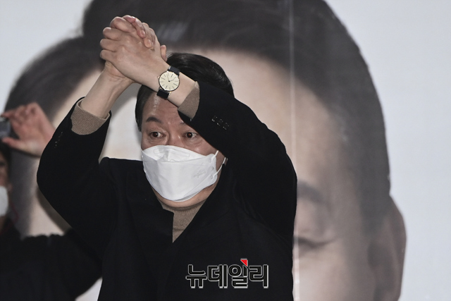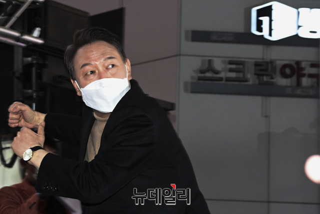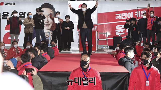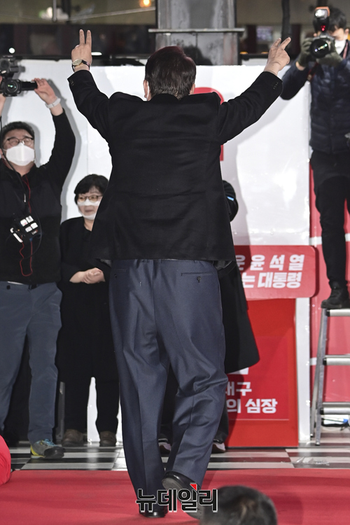 윤석열 국민의힘 대선후보가 18일 오후 대구 중구 동성로 일대에서 열린 대구의 자존심으로 나라를 지키는 정권교체 유세 현장에서 유권자들로부터 지지를 받으며 어퍼컷 세리머니를 하고 있다. (대구=강민석 기자)