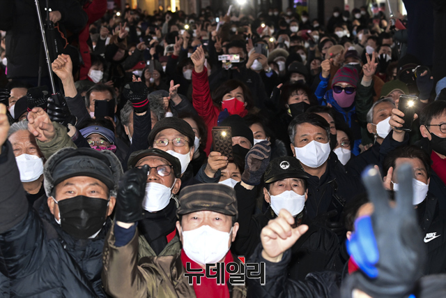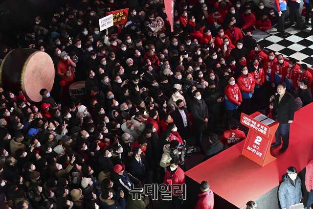 윤석열 국민의힘 대선후보가 18일 오후 대구 중구 동성로 일대에서 열린 대구의 자존심으로 나라를 지키는 정권교체 유세 현장에서 유권자들에게 인사를 하고 있다. (대구 =강민석 기자)