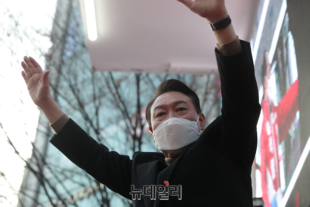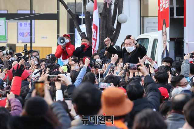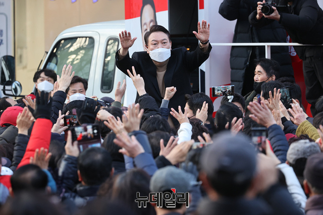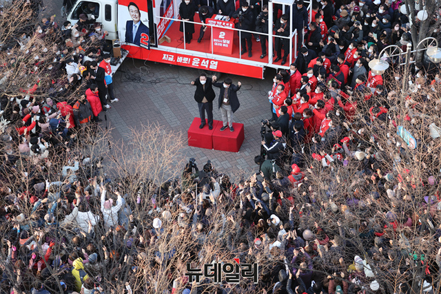 대구, 경북지역을 방문중인 윤성열 국민의힘 대선후보가 18일 오수 대구 달성군 대실역사거리에서 열린 유세에서 이준석 대표와 손을 들어 지지자에게 화답하고 있다. (사진=윤석열 캠프)