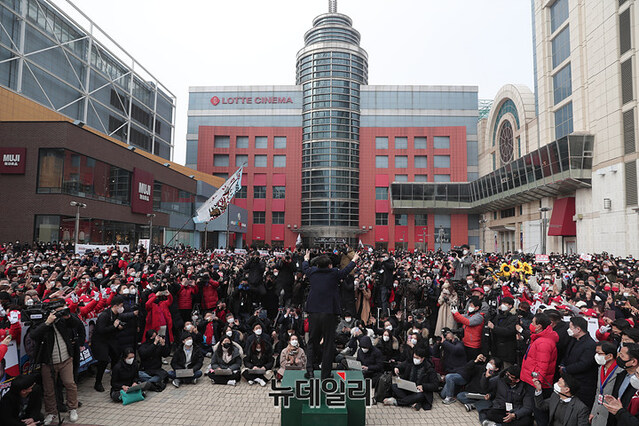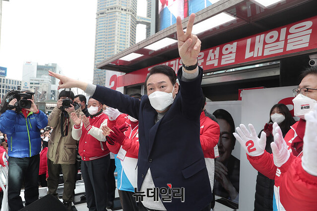 윤석열 국민의힘 대선 후보가 19일 오전 울산 남구 삼산동 유세현장에서 시민들을 향해 지지를 호소하고 있다. (사진=윤석열 캠프)
