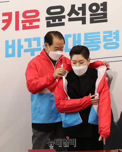 권영세 국민의힘 선거대책본부장과 입당한 독립운동가 백범 김구 선생의 증손인 김영 순천향대학교 의료아이티공학과 연구교수가 21일 오전 서울 여의도 국회에서 열린 입당식에서 기념촬영을 하고 있다. (사진=공동취재단)