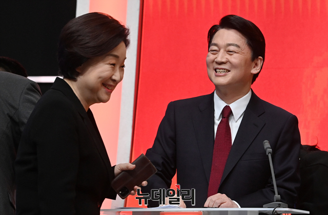 심상정 정의당 후보와 안철수 국민의당 후보가 21일 오후 서울 상암동 MBC에서 열린 중앙선거관리위원회 주관 첫 토론회에서 인사를 나누고 있다. (사진=한국인터넷신문협회)