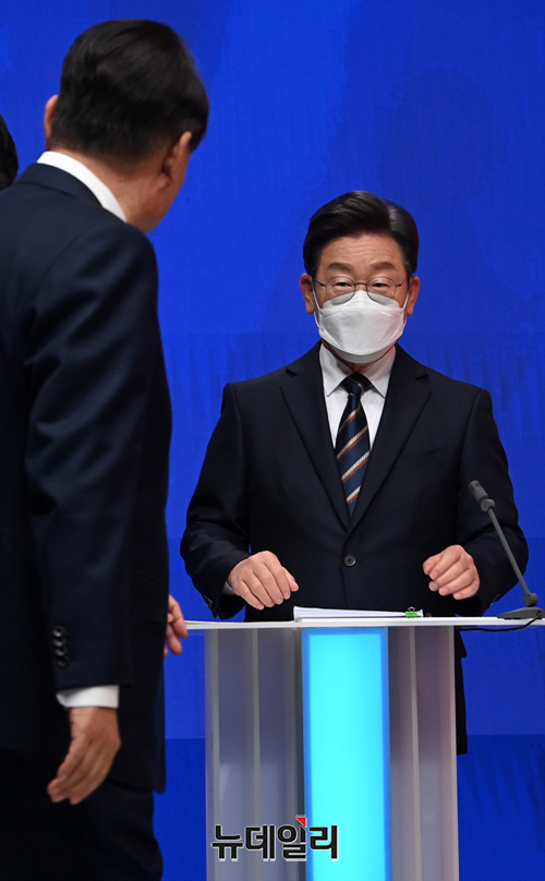 이재명 더불어민주당 대선후보가 21일 오후 서울 마포구 MBC 미디어센터에서 열린 중앙선거관리위원회 주관 첫 토론회에서 토론 준비를 하고 있다. (사진=한국인터넷신문협회)