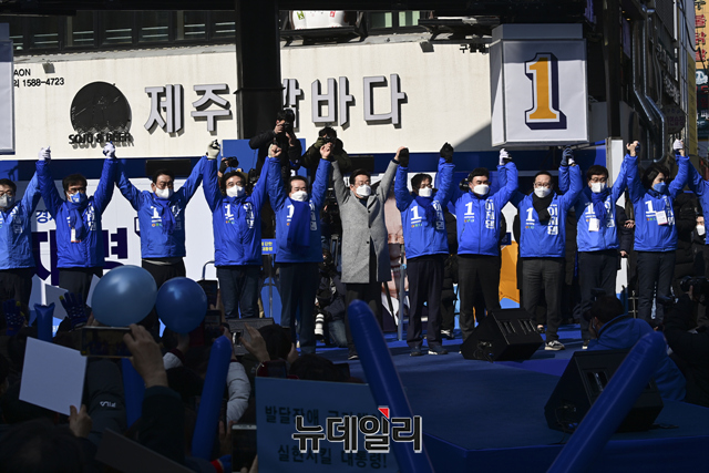 이재명 더불어민주당 대선후보와 정세균 상임고문이 22일 오후 인천 남동구 로데오거리광장 유세 현장에서 유권자들에게 지지를 호소하고 있다. (인천=강민석 기자)
