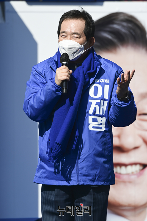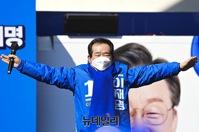 정세균 더불어민주당 상임고문이 22일 오후 인천 남동구 로데오거리광장 유세 현장에서 유권자들에게 이재명 대선후보를 지지 호소하고 있다. (인천=강민석 기자)
