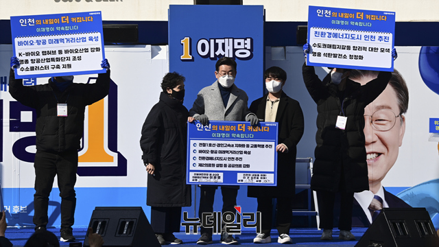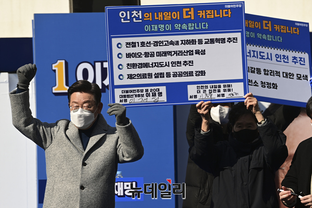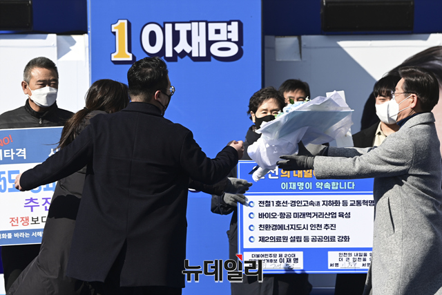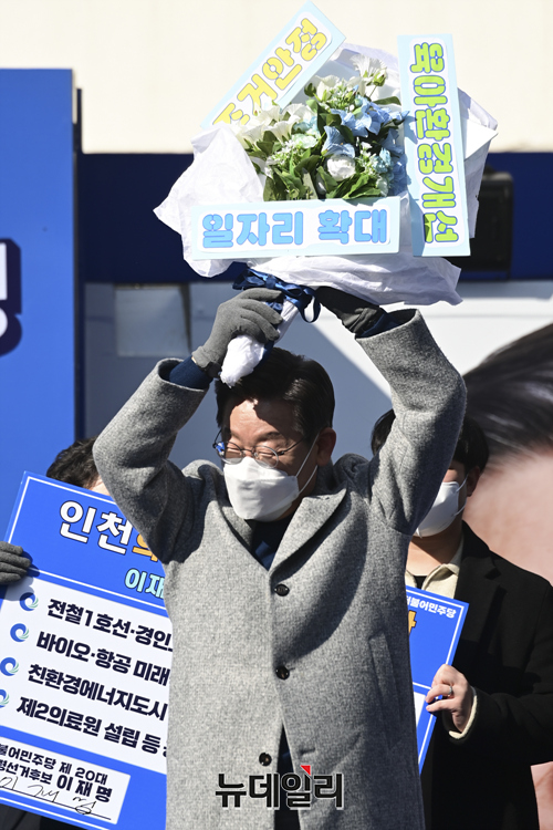 이재명 더불어민주당 대선후보가 22일 오후 인천 남동구 로데오거리광장 유세 현장에서 공약이 담긴 꽃다발을 들고 공약을 발표하고 있다. (인천=강민석 기자)