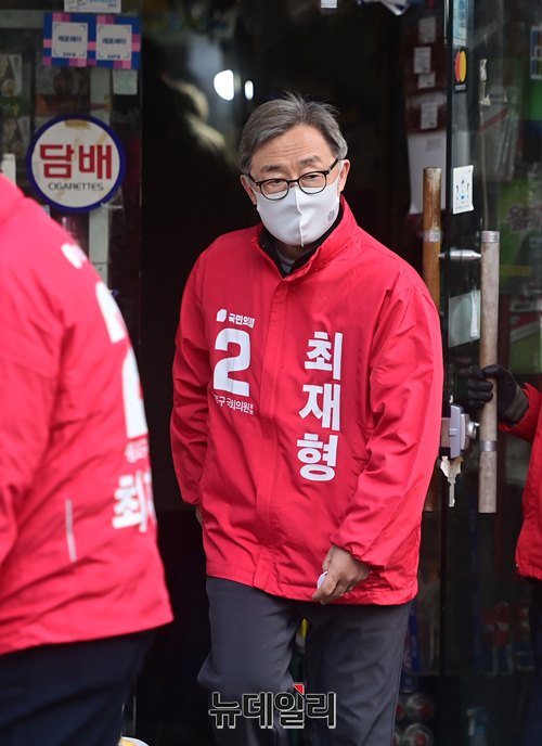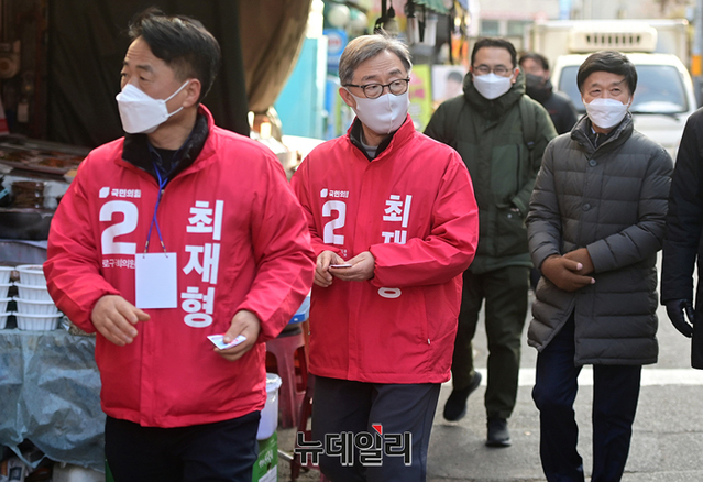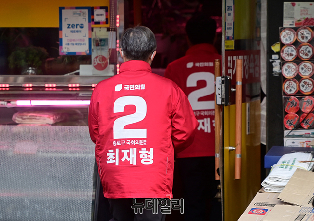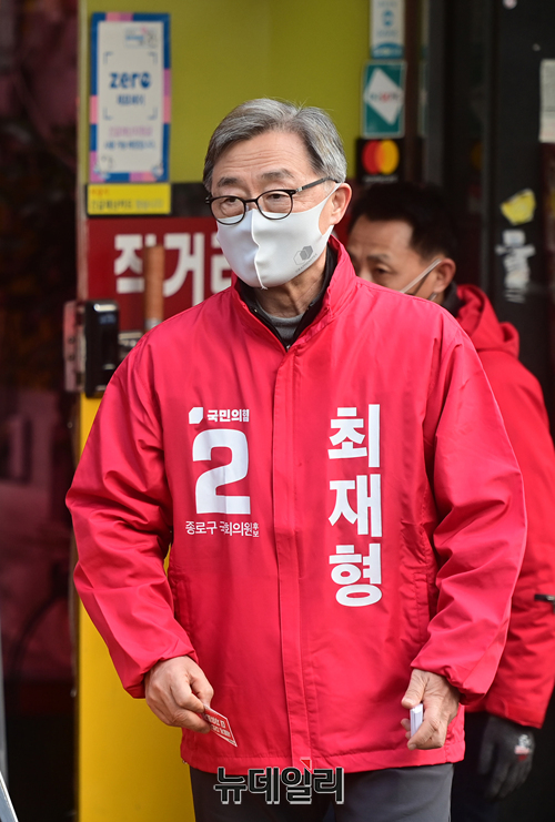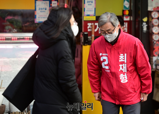 서울 종로구 보궐선거에 출마한 최재형 국민의힘 후보가 22일 오후 서울 종로구 숭인2동에서 구민들에게 인사를 하고 있다. 이날 인사에는 정인봉 전 국회의원이 함께했다.