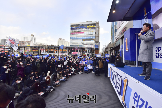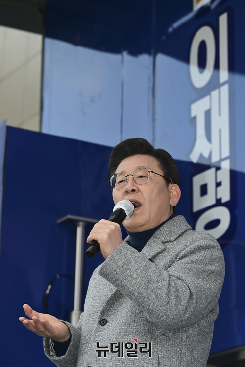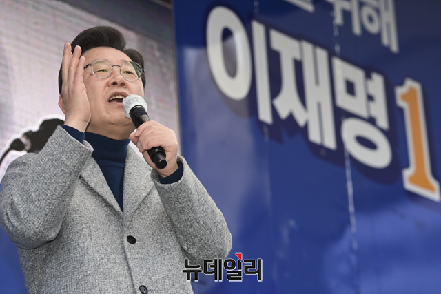 이재명 더불어민주당 대선후보가 22일 오후 경기 부천시 부천역 마루광장 유세 현장에서 시민들에게 미소를 지으며 지지를 호소하고 있다. (경기 부천=강민석 기자)