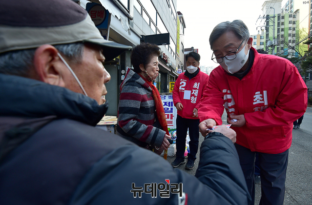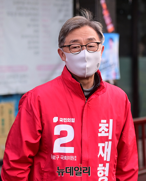 서울 종로구 보궐선거에 출마한 최재형 국민의힘 후보가 22일 오후 서울 종로구 숭인2동에서 시민들에게 인사를 하고 있다. 이날 거리인사에는 정인봉 전 국회의원이 함께했다.