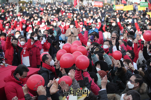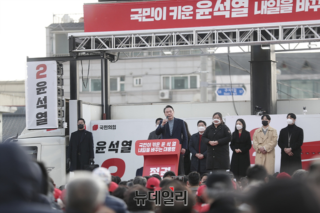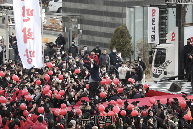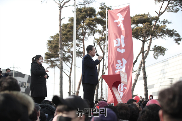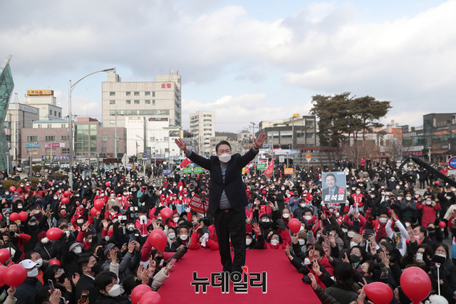 충청지역을 방문중인 윤석열 국민의힘 대선후보가 22일 오후 충남 보령시 보령문화의전당에서 열린 유세에서 지지자들에게 화답하고 있다. (사진=윤석열 캠프)