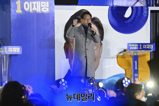 이재명 더불어민주당 대선후보가 22일 오후 경기 안산시 문화광장 유세 현장에서 유권자들에게 지지 호소를 하고 있다. (경기 안산=강민석 기자)