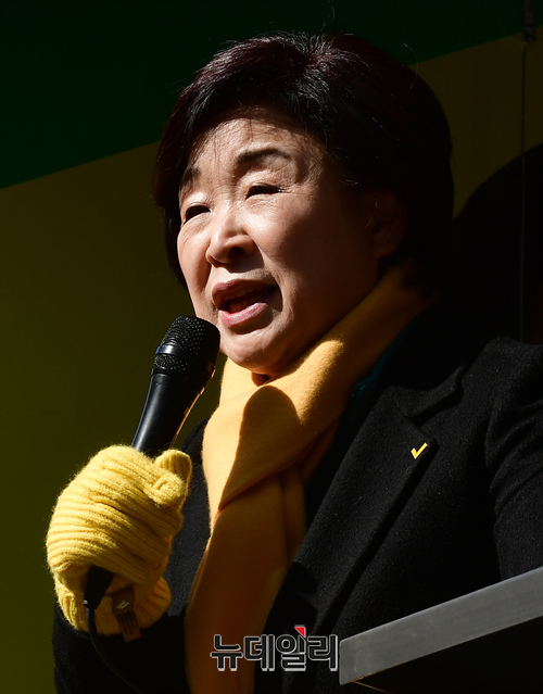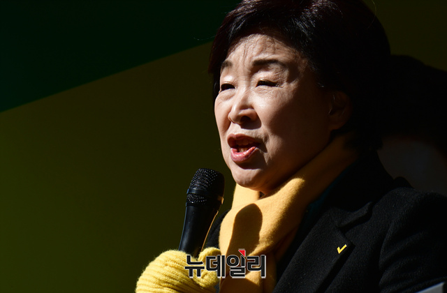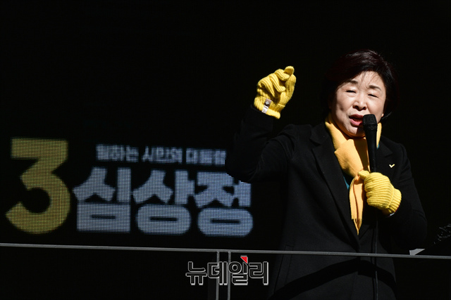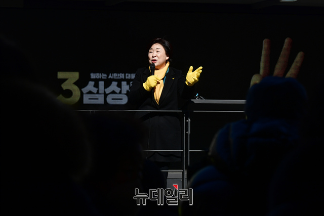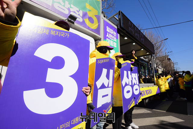 심상정 정의당 대선후보가 23일 오후 서울 마포구 망원시장 입구에서 유권자들에게 지지를 호소하고 있다.