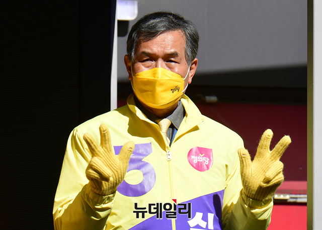 심상정 정의당 대선후보 남편 이승배 씨가 23일 오후 서울 마포구 망원시장 입구에서 열린 유세에서 유권자들에게 지지를 호소하고 있다.