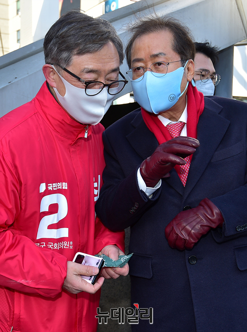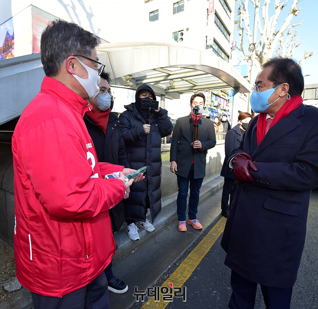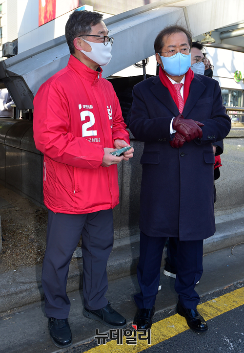 홍준표 전 대표가 23일 오후 서울 종로구 광장시장에서 열린 최재형 국민의힘 종로 보궐선거 후보 유세장을 찾아 최 후보와 대화를 나누고 있다. 앞서 홍 후보는 대학로에서 열린 최 후보의 유세장을 찾아 최 후보의 유세를 도왔다.