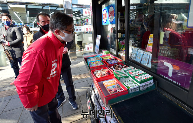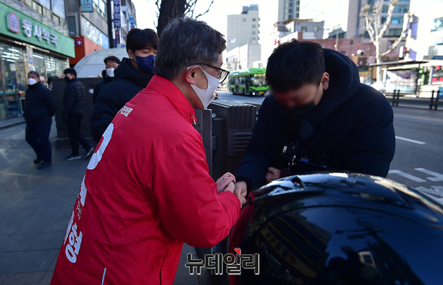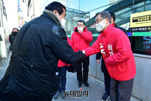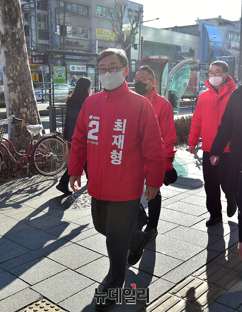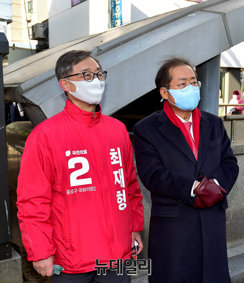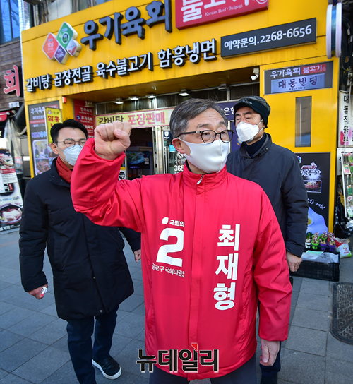 최재형 국민의힘 종로 보궐선거 후보가 23일 오후 서울 종로구 광장시장에서 시민들에게 인사를 하고 있다. 이날 광장시장 유세엔 홍준표 전 대표가 유세장을 찾아 최 후보의 지지를 호소했다.
