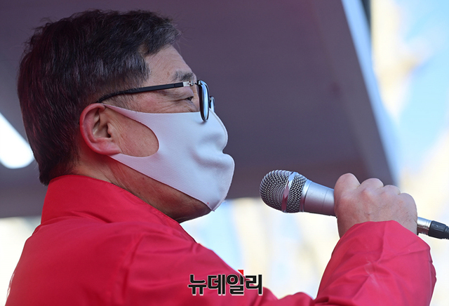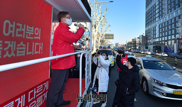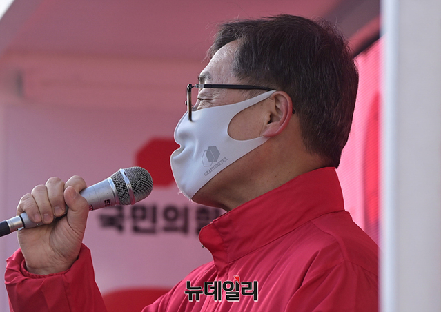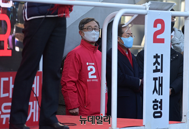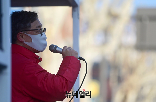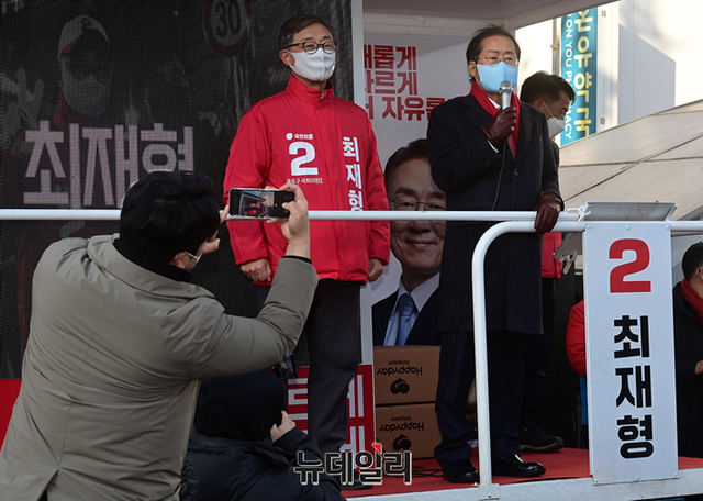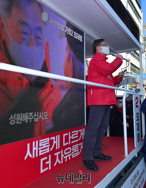 최재형 국민의힘 종로 보궐선거 후보가 23일 오후 서울 종로구 광장시장에서 유세차량에 올라 지지호소를 하고 있다. 이날 유세엔 홍준표 전 대표가 유세장을 찾아 최 후보의 지지를 호소했다.