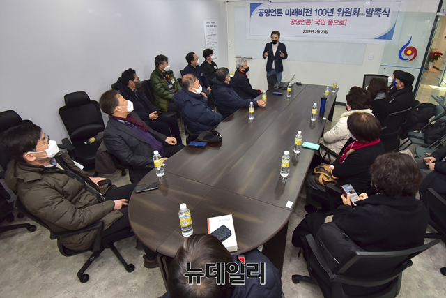 김형석 대한민국역사와미래 이사장이 23일 오후 서울 여의도 대한민국역사와미래 사무실에서 열린 '공영언론 미래비전 100년 위원회' 발족식에서 인사말을 하고 있다.