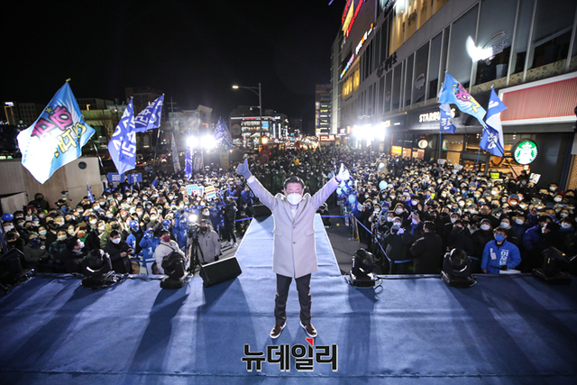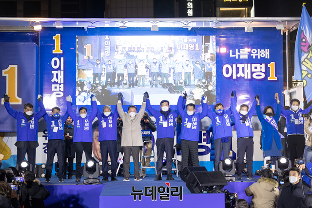 충청지역을 방문중인 이재명 더불어민주당 대선후보가 23일 오후 충북 청주시 롯데마트 앞에서 열린 유세에서 송영길 대표와 손을 잡고 지지호소를 하고 있다. (사진=이재명 캠프)