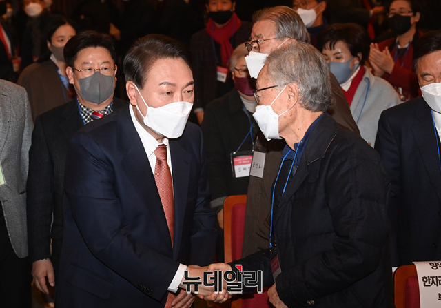 윤석열 국민의힘 대선후보가 24일 오전 국회도서관에서 열린 '여야 전직 국회의장 국회의원 윤석열 후보 지지 선언'에 참석해 인사를 나누고 있다. (사진=공동취재단)