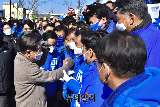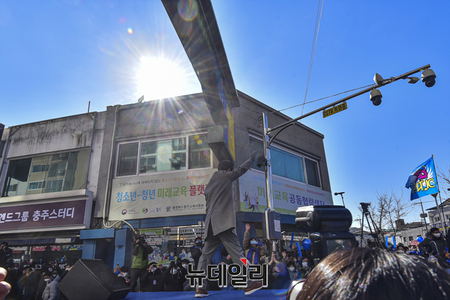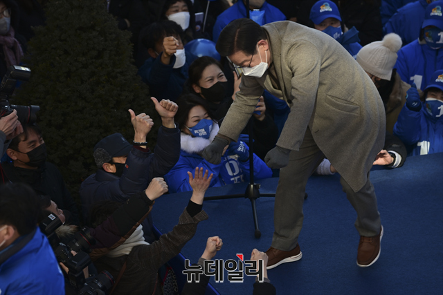 이재명 더불어민주당 대선후보가 24일 오전 충북 충주시 젊음의거리 유세 현장에서 시민들과 당원들에게 인사를 하고 있다. (충북 충주=강민석 기자)
