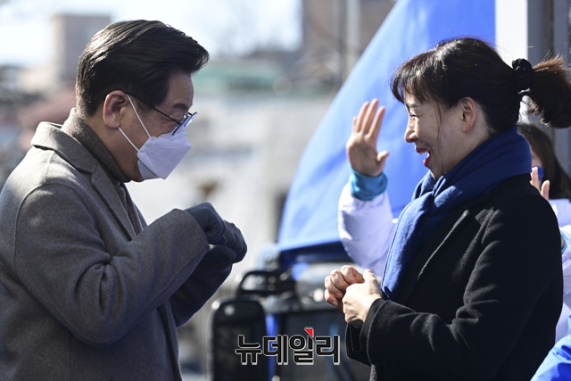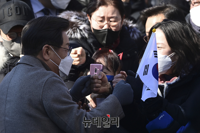 [포토] 충북 충주서 시민과 인사하는 이재명 후보