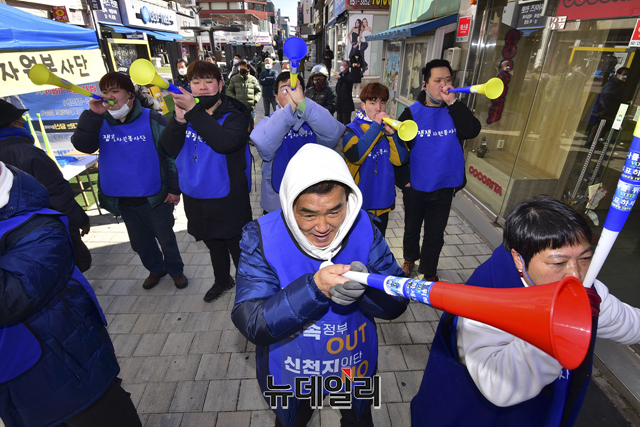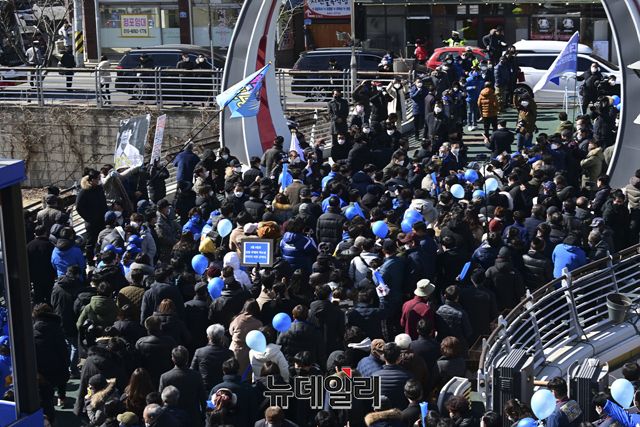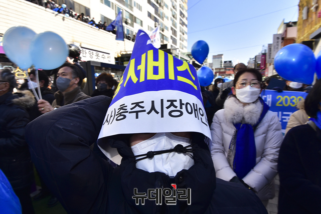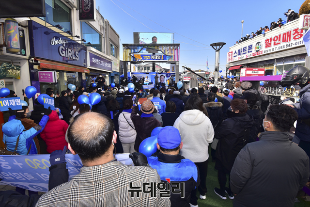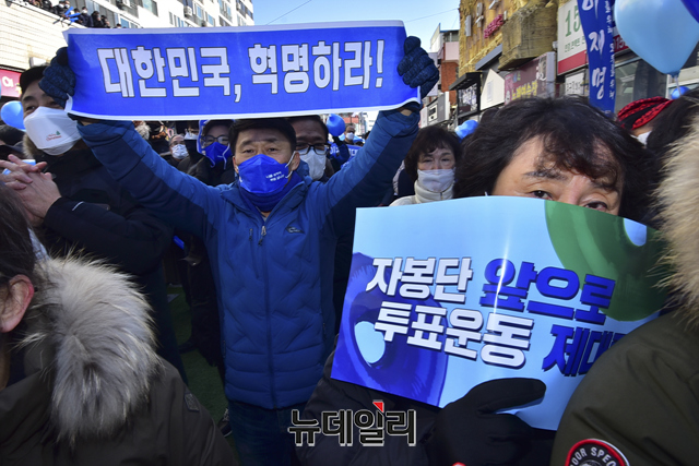 '청와대를 굿당으로 만들 순 없습니다!'가 새겨진 마스크를 쓴 이재명 더불어민주당 대선후보의 지지자가 24일 오전 충북 충주시 젊음의거리 유세 현장에서 이 후보를 응원하고 있다. (충북 충주=강민석 기자)