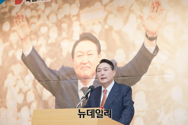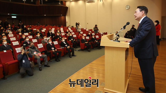윤석열 국민의힘 대선 후보가 24일 오전 국회 도서관에서 열린 '전직 여야 국회의장‧의원 윤석열 후보 지지 결의' 행사에서 발언하고 있다. (사진=공동취재단)