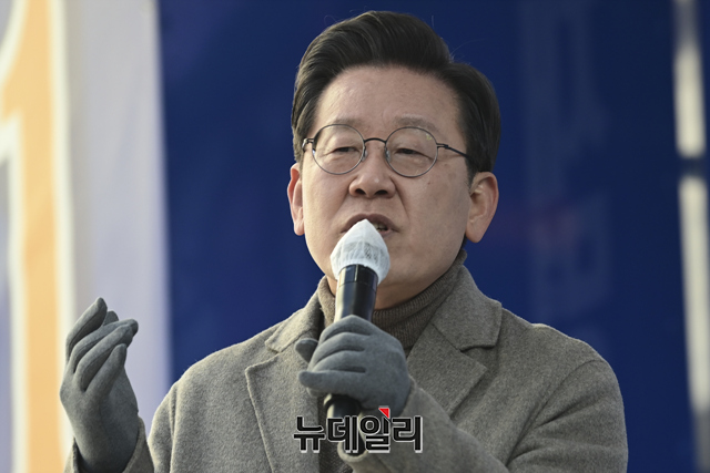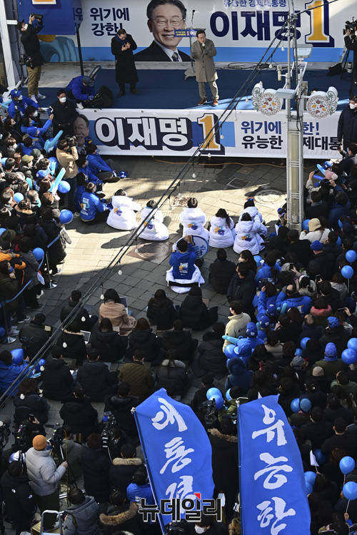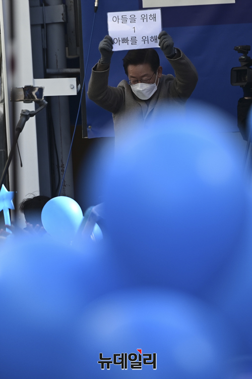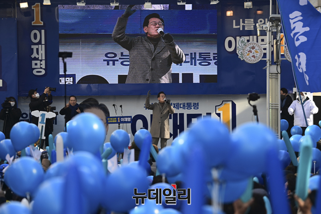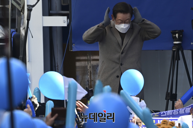 이재명 더불어민주당 대선후보가 24일 오후 강원 원주시 중앙로 문화의거리 유세 현장에서 유권자들에게 지지를 호소하며 원주공약을 발표하고 있다. (강원 원주=강민석 기자)