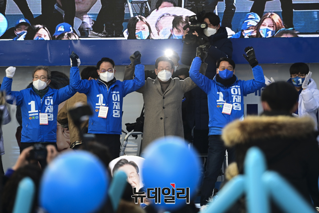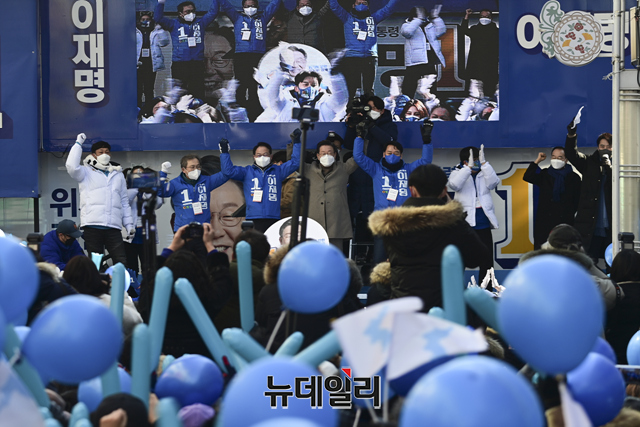 이재명 더불어민주당 대선후보가 24일 오후 강원 원주시 중앙로 문화의거리 유세 현장에서 당원들과 함께 기념촬영을 하고 있다. (강원 원주=강민석 기자)