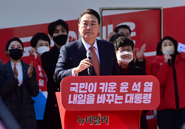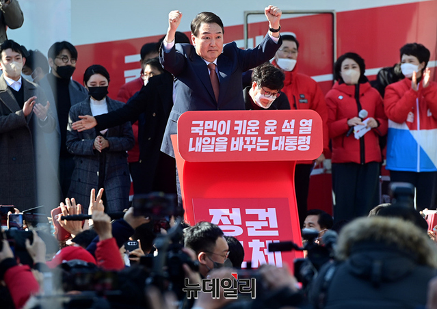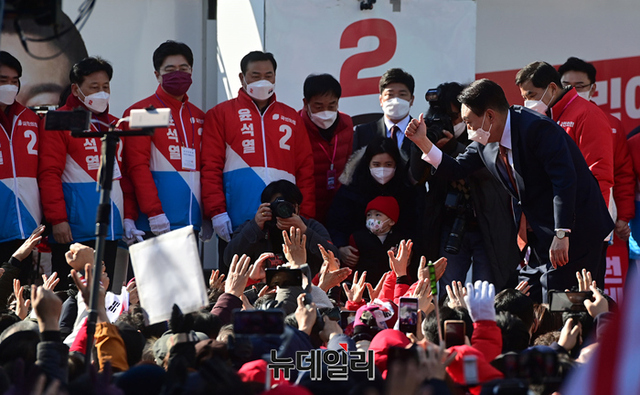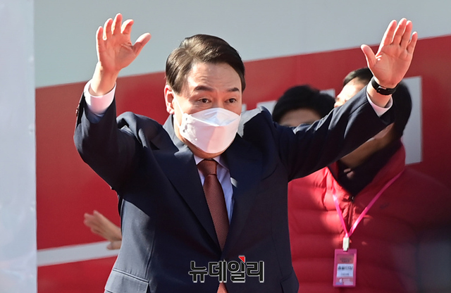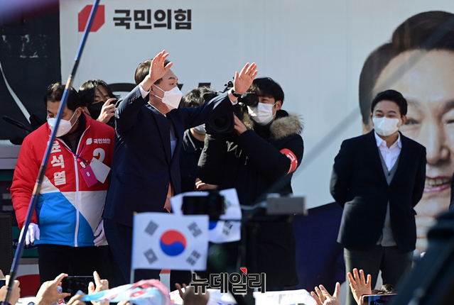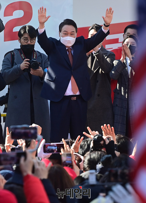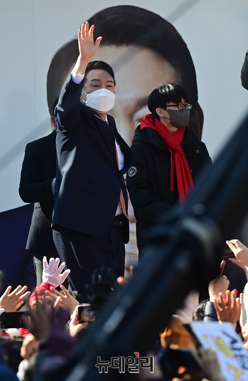 윤석열 국민의힘 대선후보가 24일 오후 경기 수원 팔달문 앞에서 열린 집중유세에서 지지자들에게 손을 흔들며 입장하고 있다. (경기 수원=정상윤 기자)