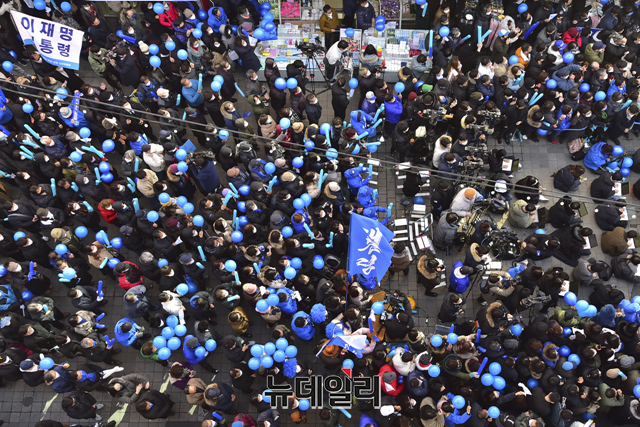 이재명 더불어민주당 대선후보의 지지자들이 24일 오후 강원 원주시 중앙로 문화의거리 유세 현장을 찾아 이 후보의 연설을 듣고 있다. (강원 원주=강민석 기자)