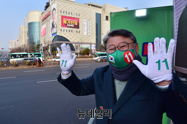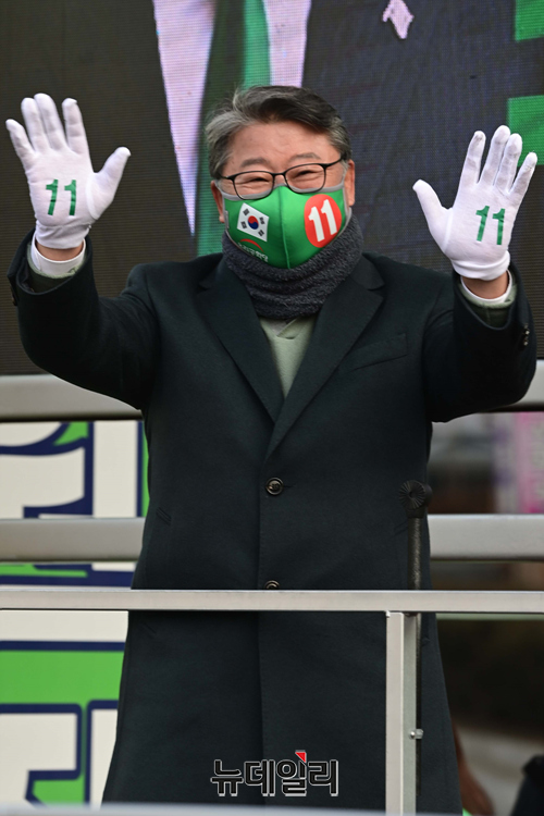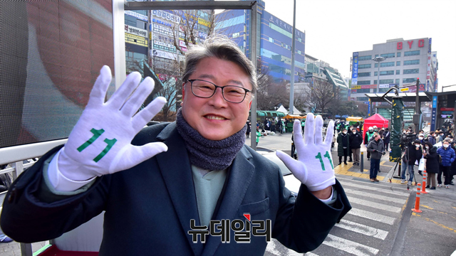 조원진 우리공화당 대선후보가 25일 오전 경기 성남시 야탑역 인근에서 유권자들에게 지지를 호소하며 인사를 하고 있다. (경기 성남=강민석 기자)