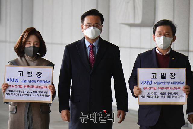 이날 참석자들은 이재명 더불어민주당 대선후보의 선거공보물 '검사 사칭' 전과 소명과 고(故) 김문기 성남도시개발공사 개발1처장과의 친분관계 진술이 허위사실이라고 주장했다.