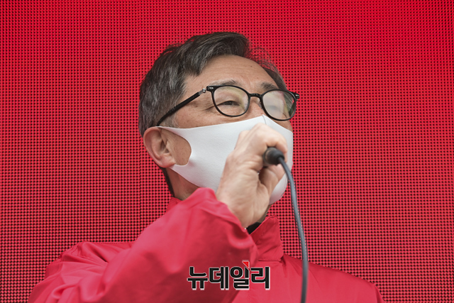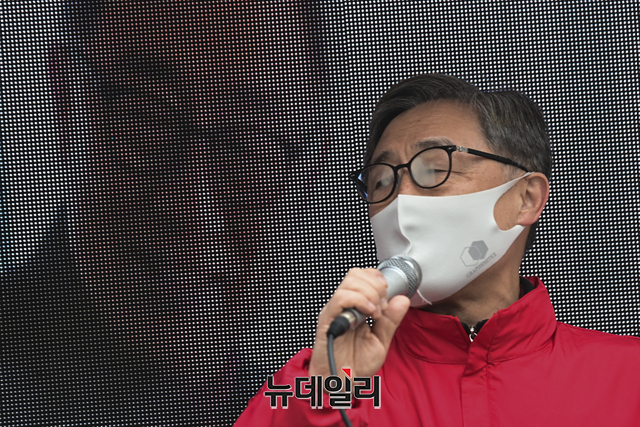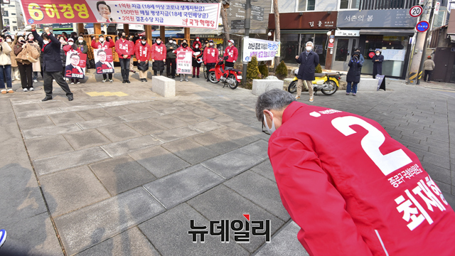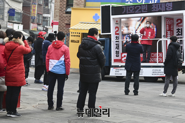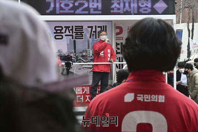 3·9 국회의원 서울 종로 재·보궐선거에 출마한 최재형 국민의힘 후보가 25일 오후 서울 종로구 통인시장 인근 유세 현장에서 유권자들에게 지지를 호소 하고 있다.