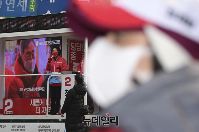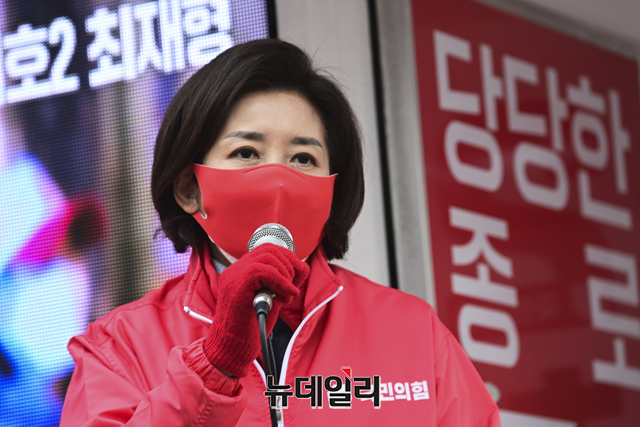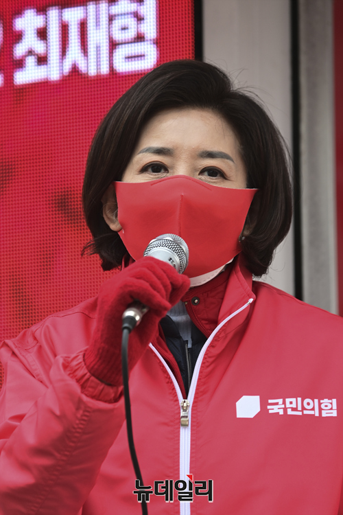 나경원 서울총괄선거대책본부장(전 의원)이 25일 오후 서울 종로구 통인시장 인근 유세 현장에서 3·9 국회의원 서울 종로 재·보궐선거에 출마한 최재형 국민의힘 후보를 응원하며 유권자들에게 지지를 호소하고 있다.
