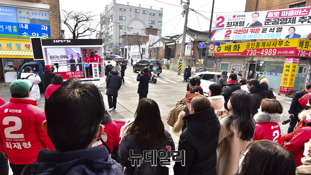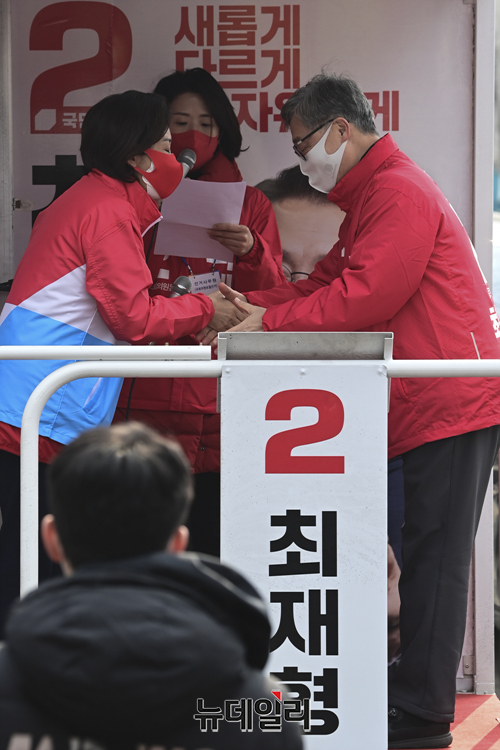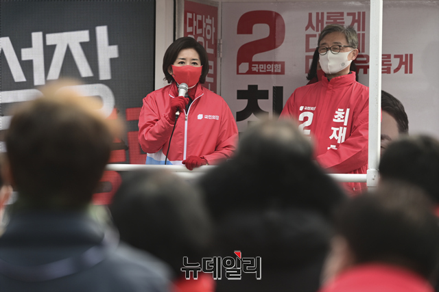 3·9 국회의원 서울 종로 재·보궐선거에 출마한 최재형 국민의힘 후보와 나경원 서울총괄선거대책본부장이 25일 오후 서울 종로구 통인시장 유세 현장에서 유권자들에게 지지를 호소 하고 있다.