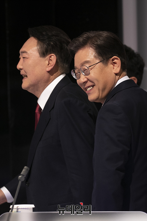 선관위가 주최 제20대 대통령선거 후보자 토론회가 25일 오후 서울 상암동 SBS에서 열린 가운데 이재명 더불어민주당 대선 후보와 윤석열 국민의힘 대선후보가 악수를 하고 있다. (사진=한국인터넷신문협회)