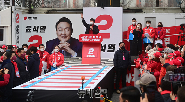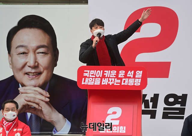 이준석 국민의힘 대표가 26일 오전 인천 연수구 스퀘어원에서 열린 집중 유세에서 연단에 올라 윤 후보의 지지를 호소하고 있다. (인천=정상윤 기자)