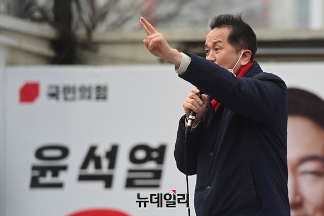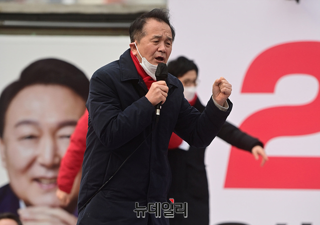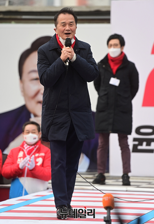 개그맨 배영만이 26일 오전 인천 연수구 스퀘어원에서 열린 윤석열 대선후보 유세에서 연단에 올라 윤 후보의 지지를 호소하고 있다. (인천=정상윤 기자)