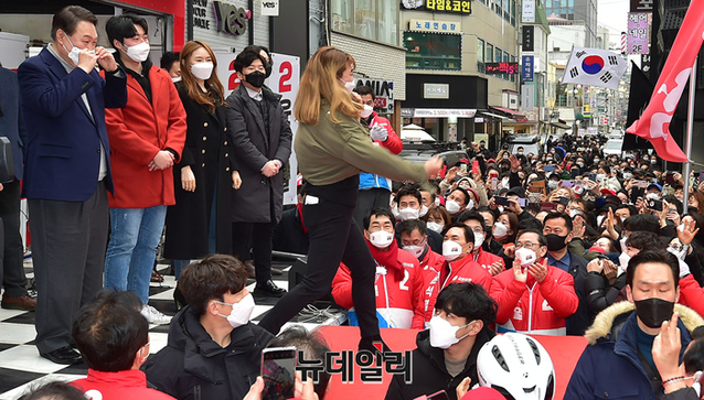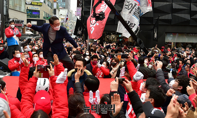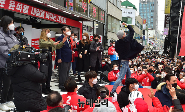 윤석열 국민의힘 대선후보 청년지지자들이 26일 오후 인천 부평문화의거리에서 열린 집중유세에서 윤 후보의 어퍼컷 세리모니를 선보이고 있다. (인천=정상윤 기자)