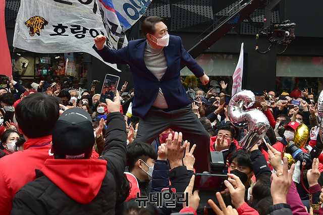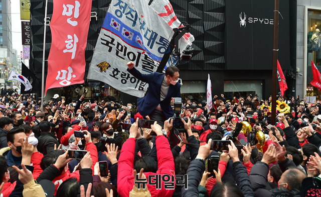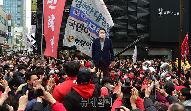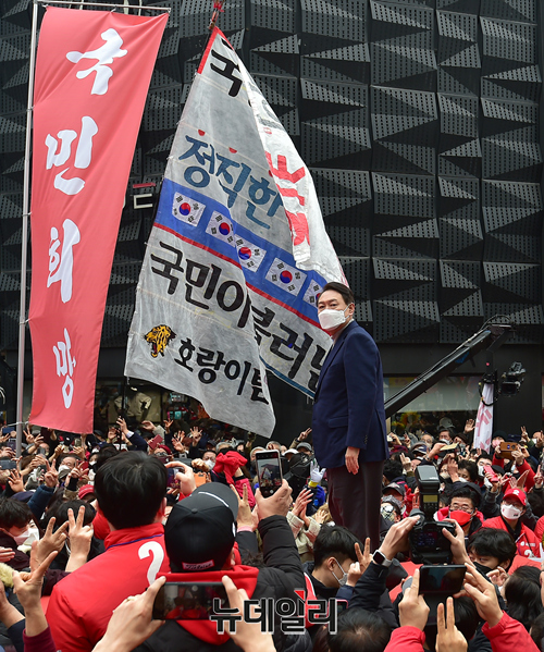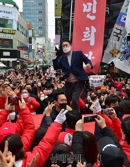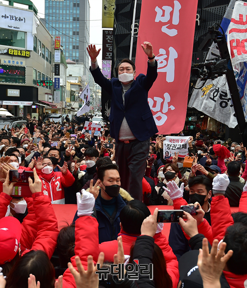 윤석열 국민의힘 대선후보가 26일 오후 인천 부평문화의거리에서 열린 집중유세에서 어퍼컷 세리모니를 선보이며 승리를 다짐하고 있다. (인천=정상윤 기자)