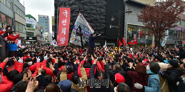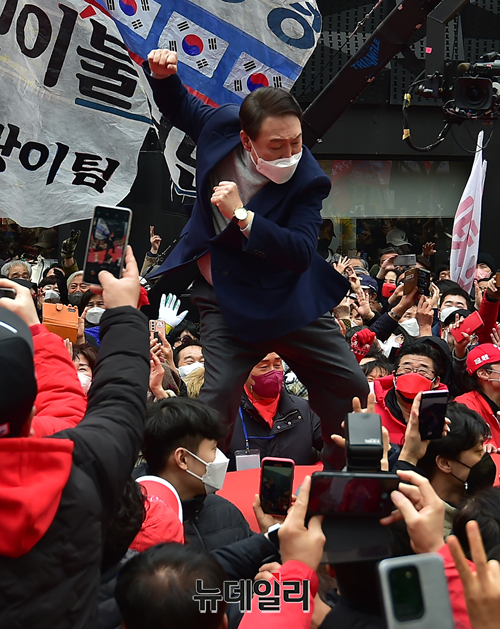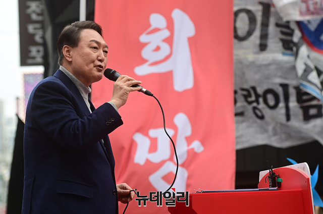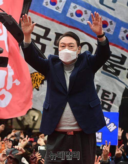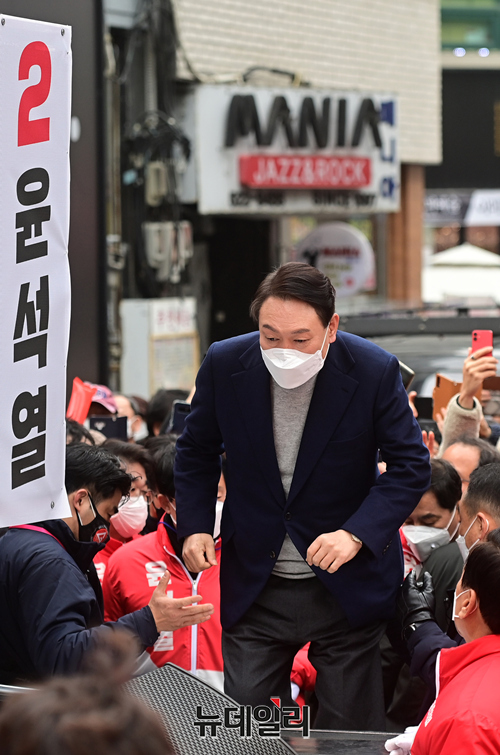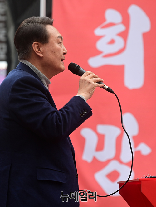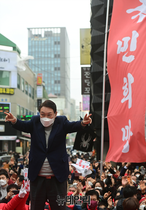 윤석열 국민의힘 대선후보가 26일 오후 인천 부평문화의거리에서 열린 집중유세에서 지지호소를 하고 있다. (인천=정상윤 기자)