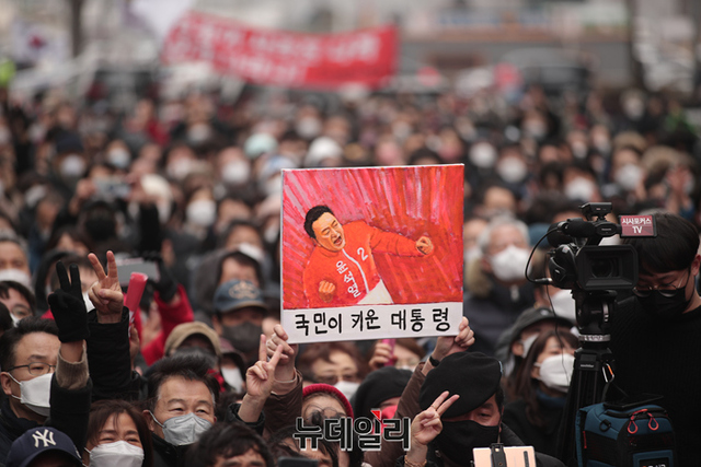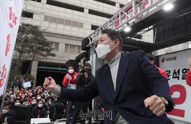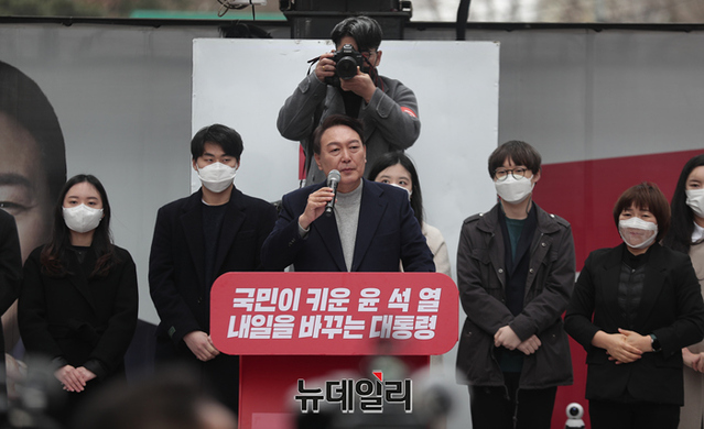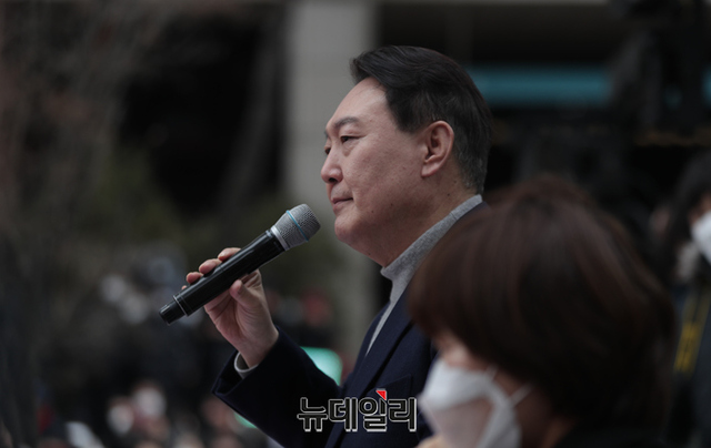 윤석열 국민의힘 대선후보가 26일 오후 서울 양천구 목동현대백화점에서 열린 유세에서 지지호소를 하고 있다. (사진=윤석열 캠프)