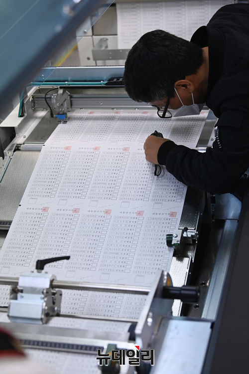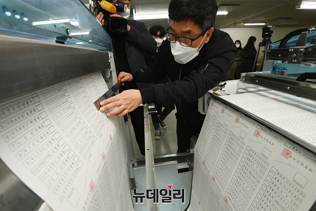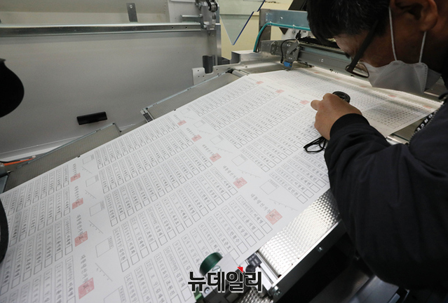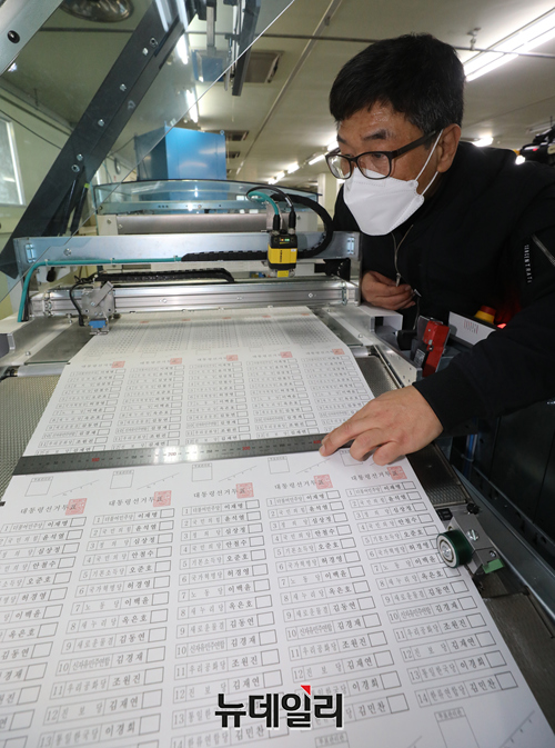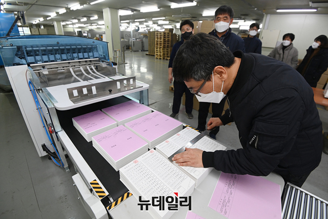 3월 9일 치러지는 제20대 대통령 선거에 사용되는 투표용지 인쇄가 시작된 28일 오전 경기 안양시의 한 인쇄소에서 투표용지 인쇄 검수작업을 하고 있다.