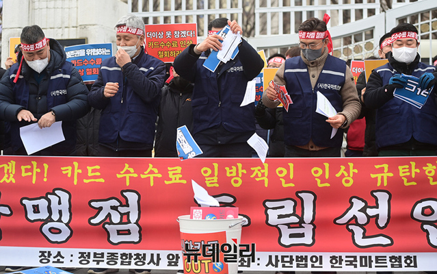 한국마트협회 회원들이 28일 오전 서울 종로구 정부서울청사 앞에서 일반가맹점 카드수수료 인방 인상 통보를 규탄하는 기자회견을 갖고 있다. 이들은 기자회견 직후 카드모형과 인상 통보문을 찢어 휴지통에 버리는 퍼포먼스를 선보였다.