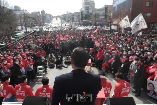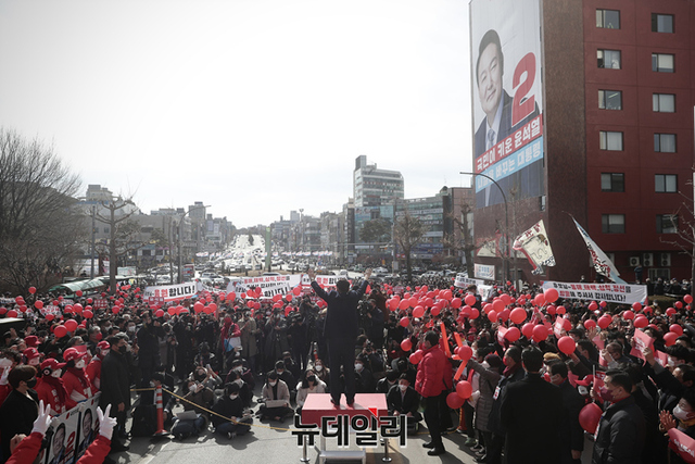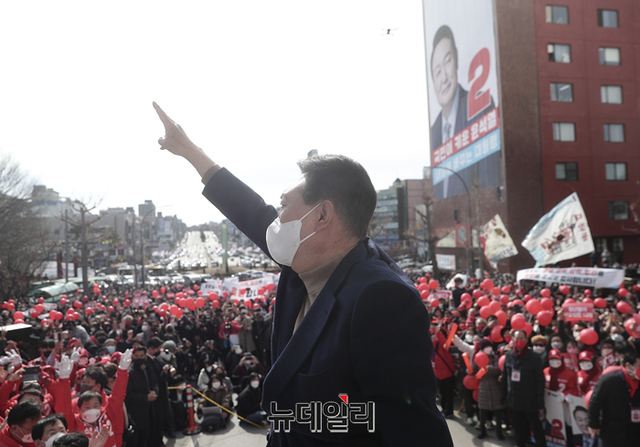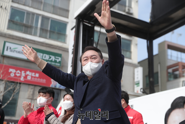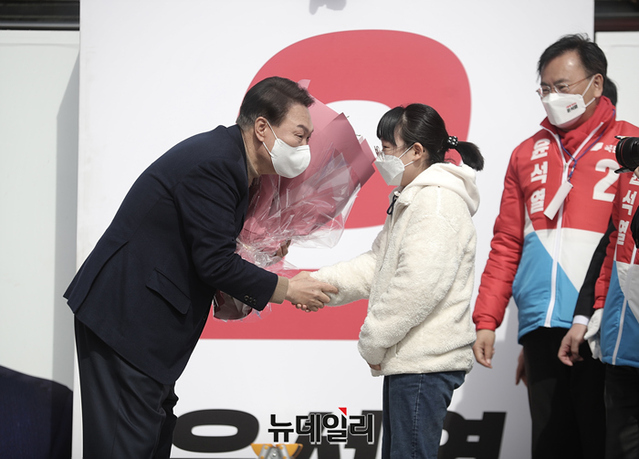 강원지역을 방문중인 윤석열 국민의힘 대선후보가 28일 오전 강원 동해시 천곡회전교차로에서 열린 집중요세에서 지지호소를 하고 있다. (사진=윤석열 캠프)