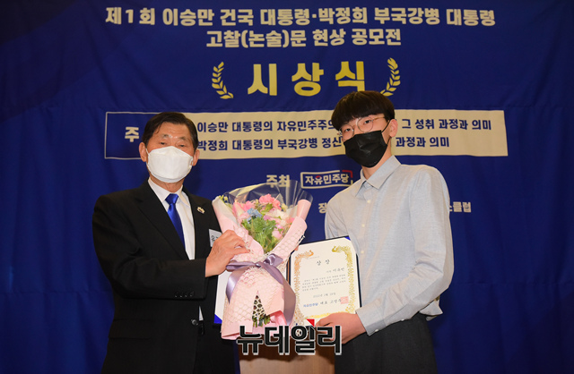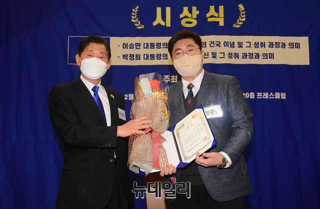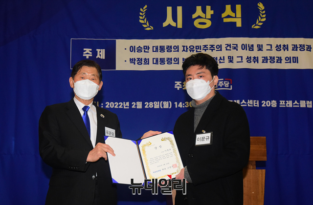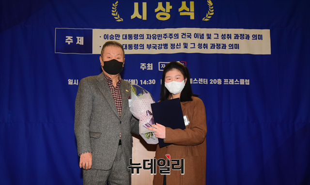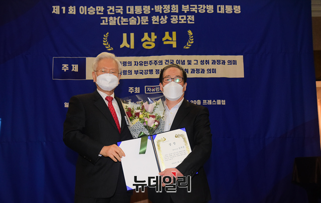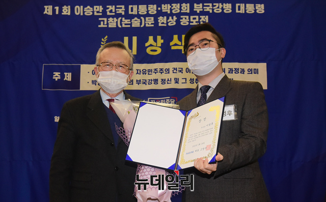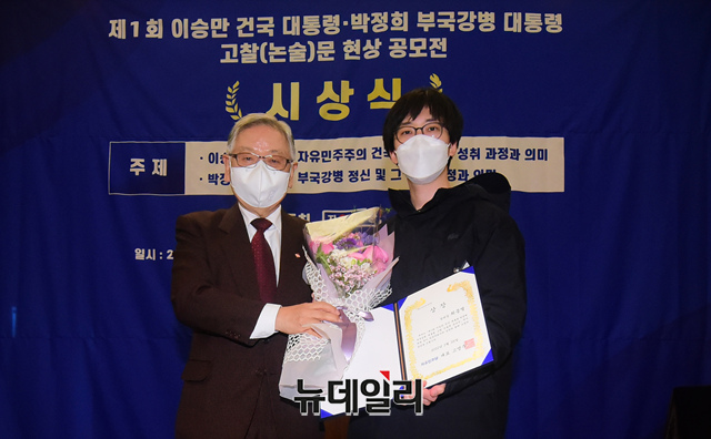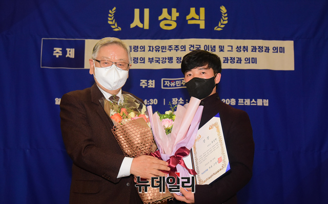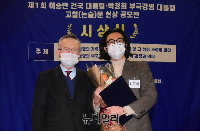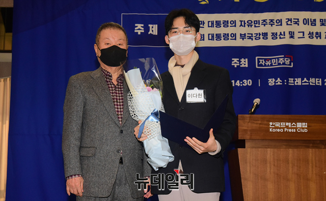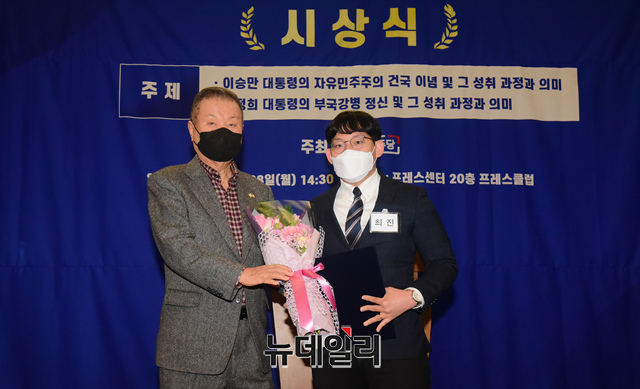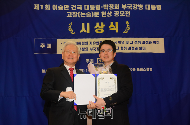 제1회 이승만 건국 대통령·박정희 부국강병 대통령 고찰문 공모전 시상식이 28일 오후 서울 중구 한국프레스센터에서 열린 가운데 수상자들이 기념사진을 촬영하고 있다.수상자는 △최우수상(조영주, 김무준) △우수상(최준혁, 이정후) △장려상(류성현, 최종열) △가작 (이다헌, 최진, 이다은, 이문규, 안준현, 이유빈) 등 12명이다.조영주(35세) 씨는 '오늘의 대한민국이 다시 이승만을 찾다'를 주제로 김무준(36세) 씨는 '박정희 대통령의 자주적 군사력 건설 정신과 현재적 의미:백곰미사일 개발전략을 중심으로'로 각각 최우수상을 수상했다.이번 공모전은 이승만, 박정희 대통령의 왜곡되고 제대로 알려지지 않는 역사적 사실을 바로 잡아 국민의 자긍심과 용기로 재도약의 발판을 마련하기 위해 마련됐다.