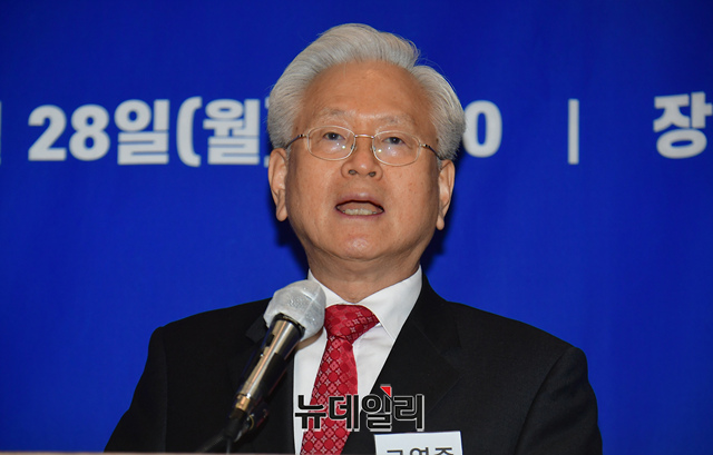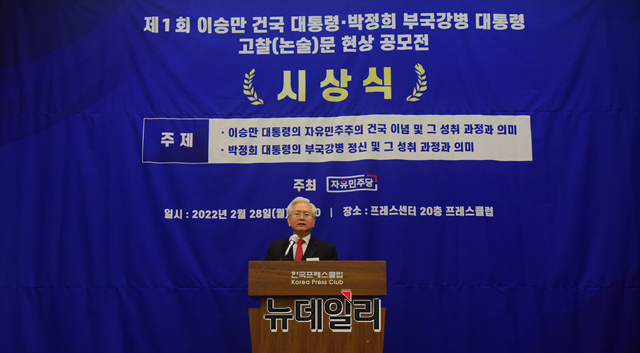 고영주 자유민주당 대표가 28일 오후 서울 중구 한국프레스센터에서 열린 제1회 이승만 건국 대통령·박정희 부국강병 대통령 고찰문 공모전 시상식에서 축사를 하고 있다.수상자는 △최우수상(조영주, 김무준) △우수상(최준혁, 이정후) △장려상(류성현, 최종열) △가작 (이다헌, 최진, 이다은, 이문규, 안준현, 이유빈) 등 12명이다.조영주(35세) 씨는 '오늘의 대한민국이 다시 이승만을 찾다'를 주제로 김무준(36세) 씨는 '박정희 대통령의 자주적 군사력 건설 정신과 현재적 의미:백곰미사일 개발전략을 중심으로'로 각각 최우수상을 수상했다.이번 공모전은 이승만, 박정희 대통령의 왜곡되고 제대로 알려지지 않는 역사적 사실을 바로 잡아 국민의 자긍심과 용기로 재도약의 발판을 마련하기 위해 마련됐다.